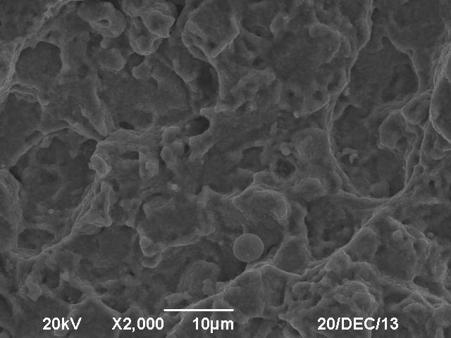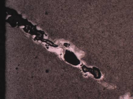 斷口開裂初期呈平直的穿晶狀態(tài),這種穿晶形態(tài)屬于疲勞擴(kuò)展的特征形貌。表層及次表層組織為調(diào)質(zhì)狀態(tài)的馬氏體位向索氏體,馬氏體位向的組織較為粗大(見圖9)。裂紋擴(kuò)展后期,斷口呈凹凸不平的沿晶斷裂特征。沿粗大斷口的凸出晶粒表面,斷續(xù)分布大小不等的圓弧凹坑,這是典型的沿晶韌窩斷口形貌,屬于過熱特征組織。斷口附近有非金屬夾雜物熔融的孔洞,表明原始軋制或鍛造溫度過高,硫化物夾雜已經(jīng)熔化為孔洞,顯著降低了材料強(qiáng)度,增加材料脆性(見圖10)。