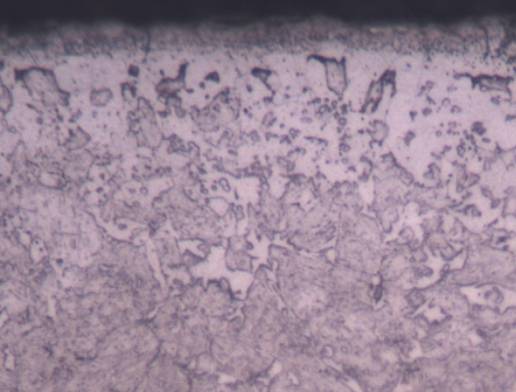 樣塊左側(cè)的表層相距不足10mm長度范圍內(nèi),斷續(xù)分布數(shù)十條表面微裂紋,裂紋沿表層圓弧狀凹坑底部開裂。根據(jù)金相組織檢查初步推斷,表層的凹坑是工件表面鍍鋅過程中,酸洗時間過長留下的腐蝕坑。表面微裂紋的深度在0.10~0.20mm。表層密集分布的黑色點狀組織是表面鍍鋅層,白亮色塊狀組織為脫碳層中的鐵素體組織。經(jīng)測量鍍鋅層為0.04mm,脫碳層為0.10mm,其中全脫碳層為0.04mm,半脫碳層為0.06mm(見圖7)。樣塊右側(cè)的表層灰黑色鍍鋅層更加明顯。右側(cè)的脫碳層深度與左側(cè)的脫碳層相近,心部組織仍然是保持馬氏體位向的索氏體組織(見圖8)。