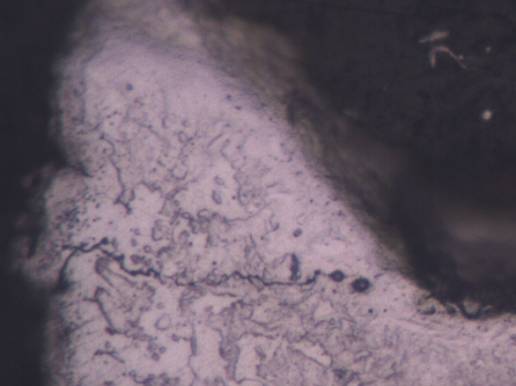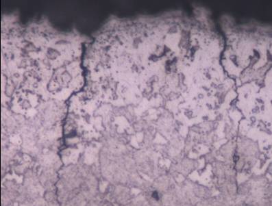 在試樣的表層存在一條細(xì)微的傾斜裂紋,裂紋兩側(cè)有較嚴(yán)重的脫碳層。裂紋間隙內(nèi)明顯可見凸出的圓弧狀晶粒自由表面,裂紋內(nèi)為斷續(xù)分布的孔洞,這是組織疏松和氣泡的特征形態(tài)。綜合以上組織特征可以斷定,該裂紋為原材料表層皮下氣泡引起的折疊裂紋(見圖5)。折疊裂紋的表層附近,有一條與工件表面垂直的微裂紋,裂紋擴(kuò)展呈周期往復(fù)的曲折狀穿晶形態(tài),這種形式的穿晶微裂紋,屬于疲勞擴(kuò)展的特征形貌(見圖6)。