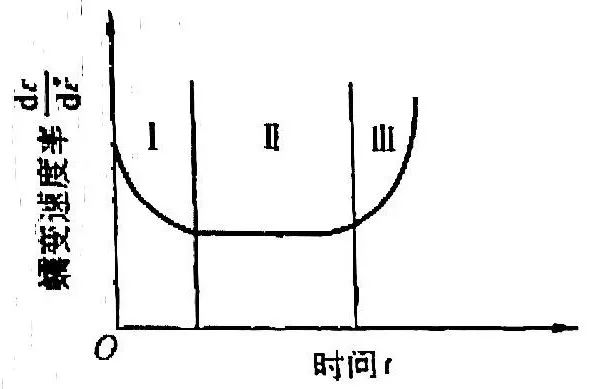 圖1 為典型的蠕變曲線(ε-t曲線),它可分為三個(gè)區(qū)域(或三個(gè)階段)。