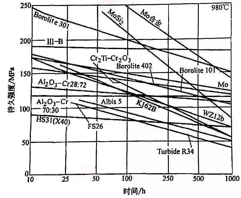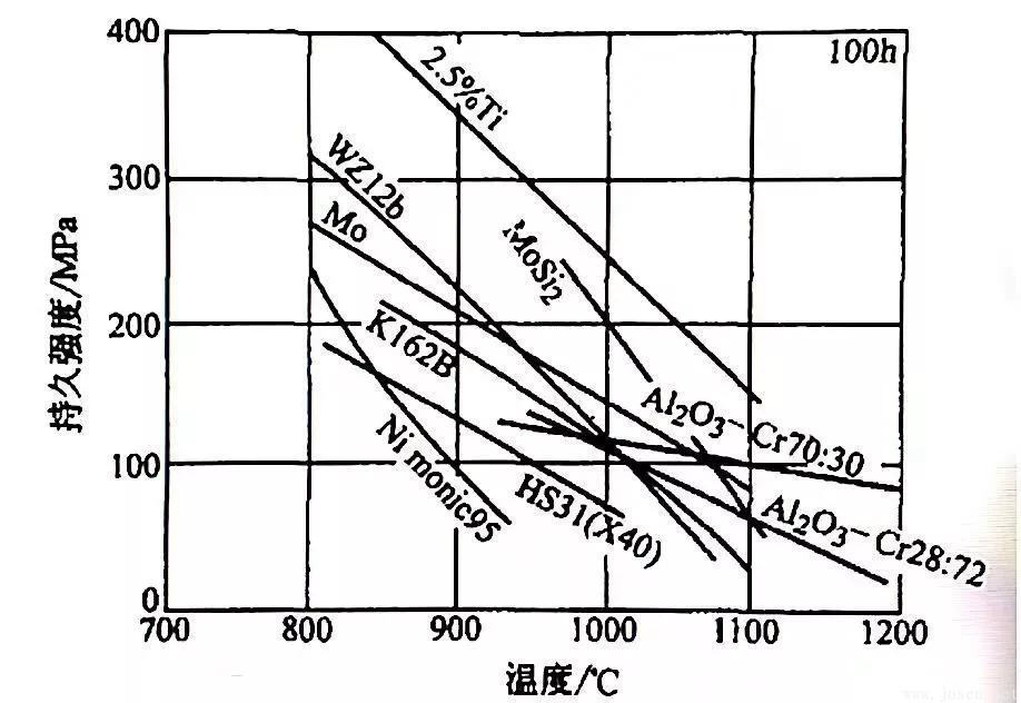 各種耐熱材料和耐熱合金的持久強(qiáng)度極限見圖8 和 圖9 。