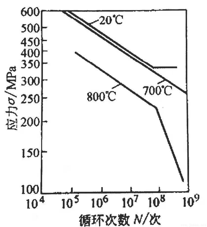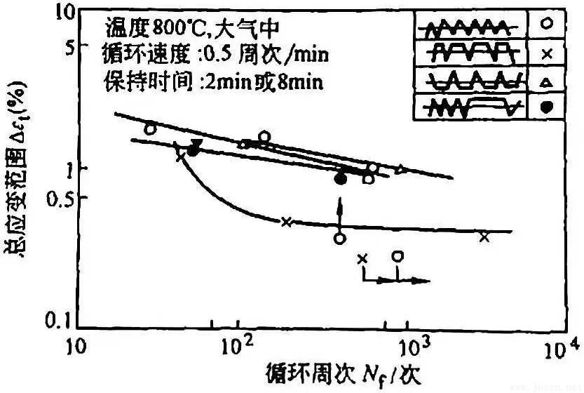 由該圖可見,在循環(huán)拉伸側(cè)保持一段時(shí)間,使疲勞壽命下降。實(shí)際上,如果要綜合考慮溫度、時(shí)間對(duì)高溫疲勞壽命的影響,必須同時(shí)考慮蠕變與疲勞兩者以及他們之間的相互作用,即由兩者的綜合作用引起的構(gòu)件失效。