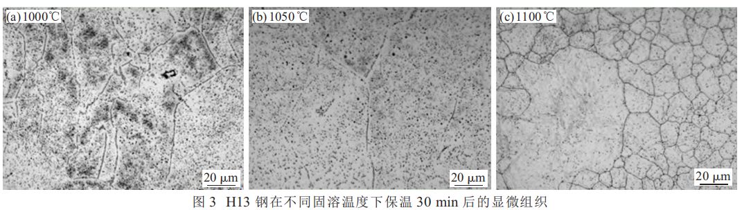 鏈狀碳化物是碳化物分布極不均勻的表現。要去除退火組織中已存在的鏈狀碳化物, 必須將材料加熱到能將沿晶分布的鏈狀碳化物溶解的溫度,使二次碳化物發生回溶、擴散、再分配,從而提高碳化物分布均勻性[7]。圖 3 為 H13 鋼在不同固溶溫度下保溫 30min 后的顯微組織。由圖 3 可以看出,固溶溫度為 1000℃時,個別細小、斷續的鏈狀碳化物得到充分溶解,而大部分粗化、連續的鏈狀碳化物僅發生初期的分斷和細化, 沿原奧氏體晶界呈鏈狀分布的碳化物輪廓依然清晰。在鏈狀碳化物聚集區內,存在大量的大顆粒、條片狀碳化物,與基體中回溶再析出的細小彌散碳化物相比, 其尺寸及分布均勻性均有較大差異。固溶溫度升高至 1050℃時,鏈狀碳化物溶解量顯著增加,剩余的沿晶碳化物均呈斷續、顆粒狀,尺寸與基體上的彌散碳化物相差不大,碳化物的尺寸及分布均勻性顯著提升。固溶溫度繼續升高至 1100℃時, 組織為晶粒尺寸不均勻的板條馬氏體,此時,鏈狀碳化物已完全回溶,細小的點狀碳化物彌散分布在基體中,碳化物分布均勻性最高,但缺少碳化物在晶界的釘扎作用, 個別晶粒優先長大出現輕微的混晶組織,使組織均勻性略有下降。