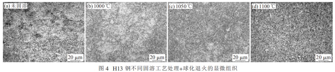 (2) 固溶處理可明顯改善 H13 鋼退火組織中的碳化物偏析,消除鏈狀碳化物,提高后序球化退火組織中碳化物的球化率及分布均勻性。在一定溫度范圍內,隨固溶溫度升高,球化退火組織越均勻。