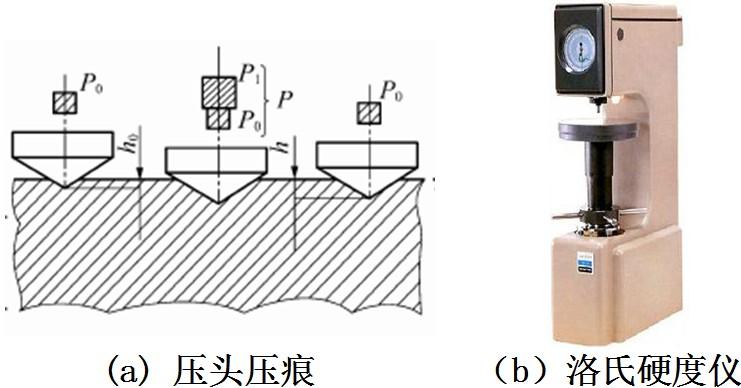 洛氏硬度是用規(guī)定的壓力,將金剛石圓錐體壓頭壓入材料的表面,測量壓痕深度h來換算(圖2-13) :
