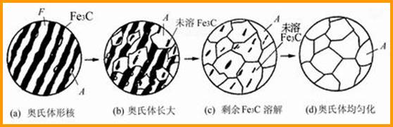 第四步 奧氏體成分均勻化:Fe3C溶解后,其所在部位碳含量仍很高,通過長時間保溫使奧氏體成分趨于均勻。