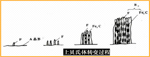 較高,鐵素體片較寬,塑性變形抗力較低,且滲碳體分布在鐵素體片之間,易引起脆斷,強度和韌性都較差。上貝氏體的轉變過程見圖3所示。