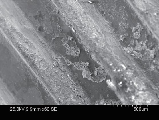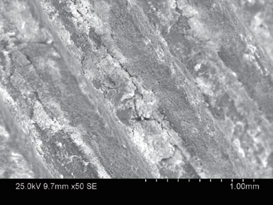 換熱銅管泄漏處內壁側置于掃描電鏡下觀察,圖4為換熱銅管泄漏區內壁腐蝕形貌,在螺紋溝槽內充滿腐蝕產物。圖5為清洗后腐蝕區域的形貌,未見明顯腐蝕坑或泄漏孔洞存在。