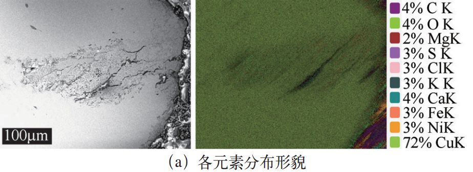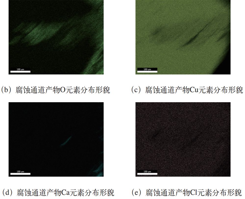 腐蝕產物能譜分析結果顯示腐蝕產物含有除基體元素外主要含有氧(O)、鋁(Al)、鎂(Mg)、硅(Si)、磷(P)、氯(Cl)、硫(S)、鉀(K)、鈣(Ca)、鐵(Fe)、鋅(Zn)等元素。主要腐蝕性元素為硫(S)、氯(Cl)和磷(P)。腐蝕通道剖面能譜面掃描結果顯示,腐蝕通道內除基體元素銅(Cu)外,主要含有氧(O)元素和少量鈣(Ca),氯(Cl)元素分布不明顯。