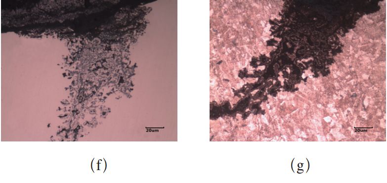 金相檢驗結果:在換熱銅管腐蝕區域觀察到從內表面開始向管外壁壁延伸的腐蝕孔洞形成彎曲的通道,通道分出許多枝杈;通道內有的填充有疏松的腐蝕產物。形貌特點很像螞蟻在地面以下挖成的迷宮一樣的隧道式巢穴,除了已穿透管壁形成泄漏的腐蝕通道,還有一些尚未穿透的腐蝕通道,說明腐蝕起點不止一處,各起始點的腐蝕發展速度也不同。