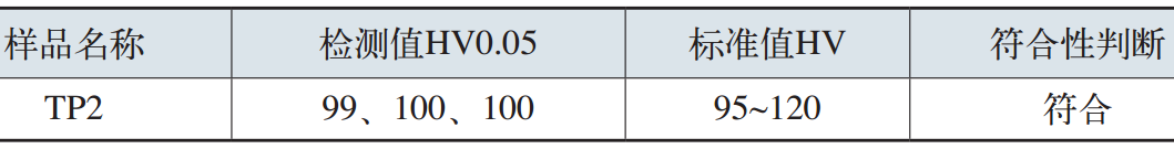 將金相試樣置于顯微硬度計下,使用0.4903N試驗力進行顯微維氏硬度檢驗,結果如表3所示。換熱銅管硬度符合GB/T 1527對TP2的技術要求。