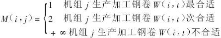 M(i,j)為機組j生產加工生產鋼卷W(i,t)的特征函數,即: