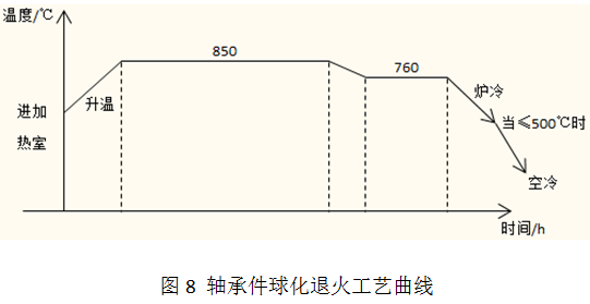 球化退火設(shè)備通常使用保護(hù)氣氛爐,使退火后的零件表面少、無氧化,并能提高軸承零件的材料利用率。軸承材料的加熱溫度為835~850℃,球化溫度為750~760℃,如圖8所示。