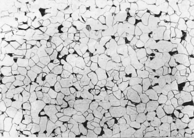 | 圖號:10-01 浸蝕劑:4%硝酸酒精 材料及狀態:10鋼 處理:退火處理 組織及說明:白色晶粒為鐵素體,黑色塊狀為片狀珠光體(體積分數約占10%)。鐵素體晶粒細小,且分布 |