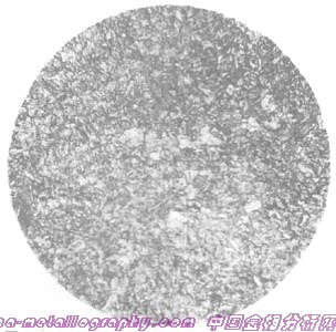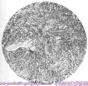 圖號(hào):35-06 浸蝕劑:4%硝酸酒精 材料及狀態(tài):35鋼 處理:930℃加熱水淬 組織及說明:基體組織為針狀和板條狀馬氏體,黑色球狀為淬火托氏體,羽毛狀為貝氏體和少量沿晶界析出的白色鐵素體。 |