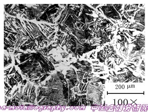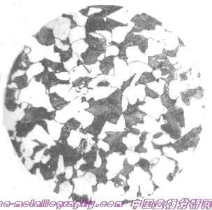 | 圖號(hào):35-05 浸蝕劑:4%硝酸酒精 材料及狀態(tài):35鋼 處理:940℃加熱保溫3h后空冷 組織及說明:黑色為細(xì)片狀珠光體,白色為鐵素體,鐵素體大部分沿奧氏體晶界析出,部分在奧氏體晶粒內(nèi)成條狀或針狀析出,呈魏氏組織狀態(tài),硬度為198HB。 35鋼Ac1為724℃,Ac3為802℃,正常的正火溫度應(yīng)為840~890℃。由于正火溫度過高,使奧氏體晶粒長(zhǎng)大至3~4級(jí)(個(gè)別已長(zhǎng)大至2級(jí)),正火后出現(xiàn)魏氏組織,使零件的脆性增加。為了改善此種組織狀態(tài),可以在正常的正火溫度重新正火,給予消除。 |