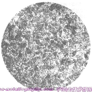 | 圖號(hào):35-03 浸蝕劑:4%硝酸酒精 材料及狀態(tài):35鋼 處理:調(diào)質(zhì)處理 組織及說明:某產(chǎn)品調(diào)質(zhì)處理后心部組織,回火索氏體及白色沿晶界分布的鐵素體,硬度為21HRC。 35鋼的淬透性較差,當(dāng)工件截面稍大些,則淬不透,心部組織仍會(huì)有鐵素體存在。 |