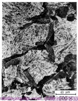 圖號(hào):35-04 浸蝕劑:4%硝酸酒精 材料及狀態(tài):35鋼 處理:鍛造空冷 組織及說明:由于加熱溫度過高,晶粒粗化,空冷時(shí)形成魏氏體組織。 |