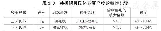 共析鋼過冷奧氏體在550℃~MS范圍內(即從C曲線“鼻尖”處到MS線)等溫轉變成貝氏體,用符號“B”表示。由于在該范圍內轉變溫度比較低,過冷度比較大,因而形成過飽和碳的鐵素體與碳化物組成的兩相機械混合物,即貝氏體。根據(jù)等溫轉變溫度和產物的組織形態(tài)不同,貝氏體又分為上貝氏體和下貝氏體兩種,分別用“B上”和“B下”表示。上貝氏體的等溫轉變溫度為550℃~350℃,其組織呈羽毛狀,強度、塑性、韌性較差,基本無實用價值。下貝氏體的等溫轉變溫度為350℃~MS,其組織呈黑色針片狀,具有較高的硬度、強度和耐磨性,同時塑性、韌性也良好,生產上常采用等溫淬火獲得高韌性的下貝氏體組織。貝氏體轉變產物的組織、性能見下表。