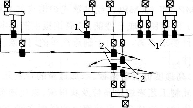 粗軋機(jī)采用順列式或連續(xù)式布置,精軋機(jī)成兩橫列且相互錯開布置的型材軋機(jī),也叫布棋式軋機(jī)(見圖)。兩列精軋機(jī)的軋輥轉(zhuǎn)動方向相反以實(shí)現(xiàn)穿梭軋制。