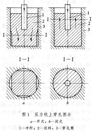在壓力機上用沖桿(頭)實現(xiàn)的壓力穿孔屬于沖擠變形,可分為開式和閉式兩種,如圖1所示。穿孔時多用方坯(有的用圓坯)或多邊形錠。沖出的金屬如果剛好充滿筒壁與坯料之間的自由空間時的壓力穿孔為開式穿孔,如果沖出的金屬大于自由空間的體積時,則為閉式穿孑L。多邊形鋼錠穿孔時,一般開始階段為開式穿孔,后期為閉式穿孔。