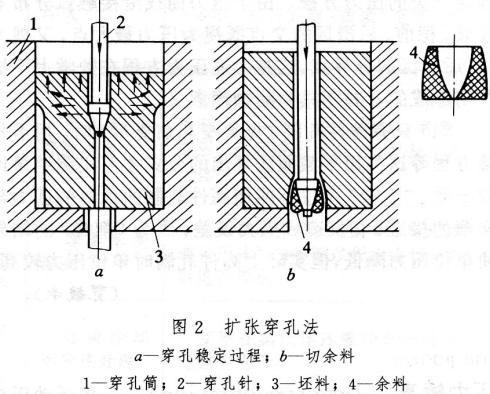 用沖擠方法將實心坯穿孑L成毛管的工序。穿孔后的毛管有帶杯底的和穿透的兩種,做為頂管、周期式軋管機軋管以及管材擠壓的坯料。