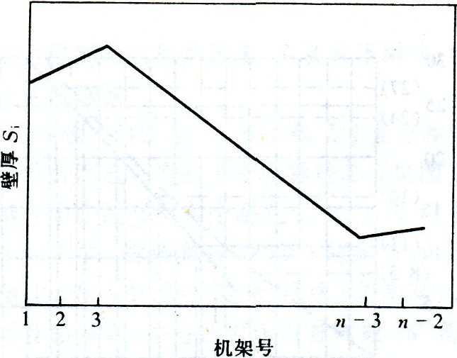 張力減徑過程中在始軋機架中由于張力漸漸升起,所以管壁有增厚現象,而在終軋機架中由于張力逐漸消失,管壁同樣也有增厚現象,因此沿軋機長度方向壁厚的變化如圖5所示。這是張力減徑過程中壁厚的變化的一般規律。若始軋機架為2~3架,取第1架壁厚增厚,第2架壁厚不變(或稍減薄,但仍大于來料壁厚),第3架壁厚減薄(但仍大于來料壁厚)。第4架減壁,并等于中間機架的減壁量。始軋機架壁增厚或減薄值一般在0.03~0.08mm范圍內。