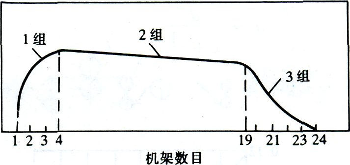 減徑率的分配 原則是:開始的幾個機架(一般為2~3架)為張力升起機架,ΔD/D值(減徑率符號ρ)較中間機架為小;末尾的幾個機架(一般為3~4架)是張力降落機架,最后一架取ΔD/D<1%,成品前架取ΔD/D<3%,倒數成品前第二架的ρ與正常ΔD/D值的差不應大于3%。圖7為各架減徑率的典型分配。