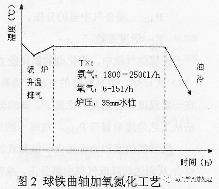 但球鐵曲軸軟氮化時,由于高碳、高硅會阻止氮的滲入和擴散,使氮化速度和氮化層深度都明顯低于鍛鋼氮化。且常出現滲層薄,表面硬度低,氮化層不均勻等現象。C.Dawers等人研究低壓氧氮碳共滲處理時指出:少量氧的加入可提高氮化氣氛的氮勢,使化合物層的深度增加,起到顯著的催滲作用。