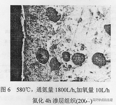由表可見,加入少量的氧滲層深度較一般氣體軟氮化有加較大的增加,可見氧對球鐵催滲起到顯著的作用。570℃,通氨量為1800—2000L/h,加氧量占0.5%左右時,表面硬度和滲層深度可達到較高值,其中通氨量為2000 L/h,通氧量10L/h(0.5%),滲層深度和表面硬度均為最大。溫度為580℃,通氨量為1800 L/h,通氧量10L/h(0.56%),可獲得高的滲層硬度Hv0.1681,滲層0.28mm,化合物層為10.90μm。滲層金相組織圖6所示。可見加入氧提高了氣氛的氮化能力,即提高氮原子的活性。氮化能力增強。當氧加入量為15 L/h時,表面硬度都出現不同程度的下降,這可能是滲層出現疏松等缺陷,導致滲層變脆有關,尚有待于進一步研究。
