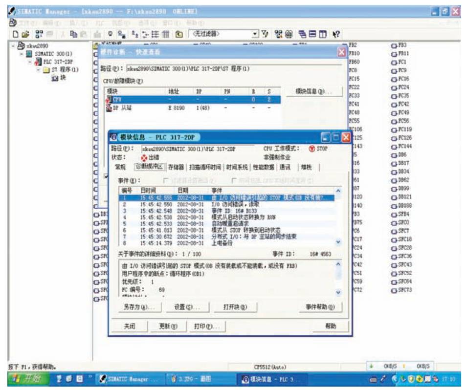 根據故障現象首先檢查了PCU上的MPI總線插頭,未發現問題。因為出現了PLC運行監控報警,用電腦聯機STEP7軟件上傳程序進行在線診斷,發現PLC報錯,進入PLC硬件診斷緩沖區,根據信息提示發現FC69功能塊出現錯誤(見圖2)。