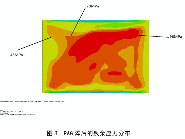 從殘留應力有限元分析結果看,如圖8所示。PAG淬火后,薄壁深腔零部件大部分區域殘留應力值在70MPa以下,只有少數區域的殘留應力值在70~96MPa之間。因此,可以更有效地控制淬火殘留應力。