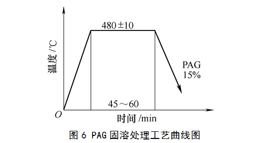 綜合生產實際,薄壁深腔零部件采用PAG作為淬火冷卻介質進行固溶處理工藝方法,工藝曲線圖6所示。