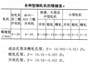 型鋼軋機(jī)輥縫值的大小取決于機(jī)架的構(gòu)造、軋制力的大小、軋輥直徑大小以及孔型的用途。對(duì)于壓下量很小的成品孔型和其他精軋孔型應(yīng)盡量選取小的輥縫值,以獲得幾何形狀正確和尺寸精確的產(chǎn)品;對(duì)于開坯孔型和延伸孔型,輥縫值的大小對(duì)產(chǎn)品形狀的正確性和尺寸精確性影響不大,所以輥縫值可適當(dāng)增大,以減少孔型切入軋輥的深度,增加軋輥重車系數(shù)和提高軋輥的使用壽命,同時(shí)也有利于采用調(diào)整輥縫值的辦法在同一個(gè)孔型中獲得各種高度尺寸的軋件,從而擴(kuò)大孔型的共用性,減少換輥次數(shù),提高軋機(jī)作業(yè)率。但是,輥縫值過大時(shí),軋槽過淺,起不到限制金屬橫向流動(dòng)的作用。輥縫值s一般根據(jù)表中所列經(jīng)驗(yàn)數(shù)據(jù)選取。輥縫值有時(shí)也根據(jù)軋輥直徑D按下述經(jīng)驗(yàn)關(guān)系式確定: