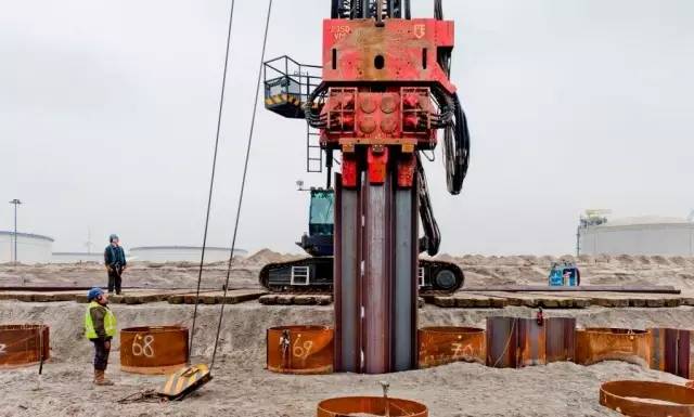 河里的防水圍堰。通常選用更寬點(diǎn)的6號(hào)樁。鎖口鋼板樁的長(zhǎng)度在15到24米之間,由416L型液壓振動(dòng)錘驅(qū)打。更復(fù)雜的可能含有礫石的土壤,可以選擇中等大小的錘,如815C。圍堰能為混凝土基礎(chǔ)的修建提供干燥的碼頭。橋塔建成之后,鋼板樁會(huì)被取出重新利用。需要避免使用泥漿和隔水墻的深基礎(chǔ)。有時(shí)候鋼板樁會(huì)與護(hù)筒樁配合使用,以獲得更大的側(cè)向承載力。這些應(yīng)用需要AZ 型鋼板樁,長(zhǎng)度為24 -36米。對(duì)于挖掘深度達(dá)到20米的情況,這些寬的鋼板樁很經(jīng)濟(jì),能提供很大的側(cè)向承載力。中等大小的815C或更大的1412C常被選來完成這些環(huán)保建設(shè)項(xiàng)目。