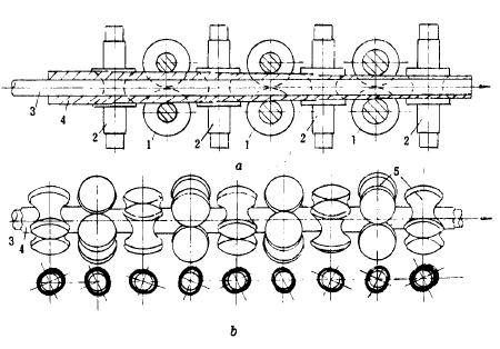 1-水平軋輥 2-垂直軋輥 3-芯棒 4-軋件 5-按不同角度布置的軋輥
