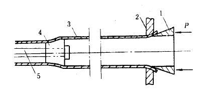 4)用頂管機組生產無縫鋼管,先將鋼錠或鋼坯用水壓機沖擠成杯狀毛坯,然后在熱狀態下進行擴徑減壁,其生產過程見圖4。其產品的最大直徑在國外已達1000mm,國內為650mm。