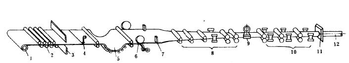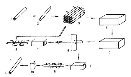 1-毛管(坯料) 2-錘頭 3-打捆 4-酸洗 5-潤滑 6-冷拔 7-中間熱處理 8-矯直 9-成品熱處理 10-切管 11-冷拔成品鋼管