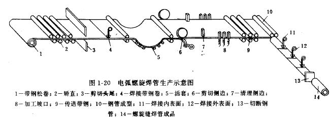 7)用焊接法生產有縫鋼管,生產焊接鋼管用直條或成卷的帶鋼做原料,常用的焊接方法有爐焊、電阻焊和電弧焊等。生產出的鋼管其焊縫有直縫和螺旋縫兩種。爐焊法只能生產直縫焊管,其產品直徑為10~114mm,壁厚為2~10mm。用電阻焊法生產的直縫焊管直徑可達620mm、壁厚為0.4~20mm;螺旋焊縫鋼管直徑可達3660mm。電弧焊接方法適用于優質鋼和合金鋼,常用來生產直徑為1000mm以上的螺旋焊管。電阻直縫焊接鋼管生產方法見圖6所示。電弧螺旋焊接鋼管生產方法見圖1%26mdash;20所示。