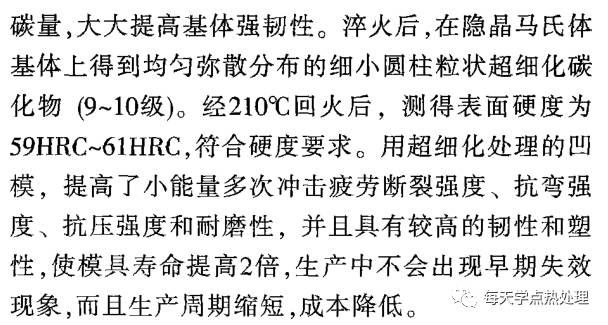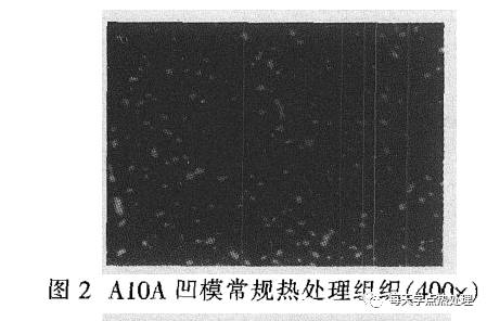 對 凹 模 進 行金 相 組 織 檢驗,其組 織 為 回 火 M十 殘留A+ ε 碳化 物,碳化物大小不均勻、晶 粒粗 大 ! 相 對而言)、 有棱 角、 不圓 整,造成 韌 度 降低,脆 性 增大,在循環應力的作用下,加速了疲勞裂紋的 萌 生,使 凹 模受到 多 次 沖 擊 時,過 早發 生疲勞斷裂。