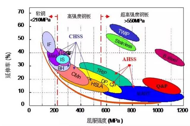 按照鋼的力學性能,可分為冷成形用低碳軟鋼(如,IF鋼),傳統(tǒng)高強鋼(如,低合金高強鋼),相變強化高強鋼(如,雙相鋼,QP鋼等);這個分類方式在汽車鋼中最為常見,我們喜聞樂見的香蕉圖就是典型的分類圖。