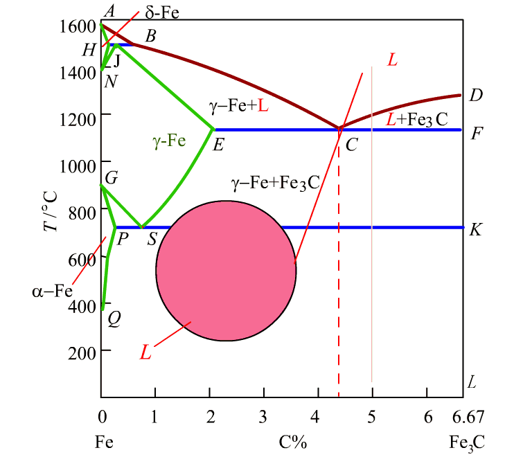 鐵碳相圖中的相有: 鐵素體:碳溶解于α-Fe中形成的固溶體,用α 或 F 表示; 高溫鐵素體(δ-鐵素體) :由于δ-Fe是高溫相,因此碳溶解于δ-Fe中形成的固溶體也稱為高溫鐵素體,用δ 表示 奧氏體:碳溶解于g-Fe中形成的固溶體,用g 或A 表示 滲碳體:鐵和碳形成的化合物,含碳量為6.69%,用Fe3C或Cm表示 鐵碳相圖中的組織: 珠光體:共析轉變的產物,是a 與Fe3C的機械混合物,用P表示。 萊氏體:共晶轉變的產物是奧氏體與滲碳體的機械混合物,用符號Ld 表示。 低溫萊氏體:這種由P與Fe3C組成的共晶體稱,用Le’表示 此外還有Fe3CⅠ、Fe3C Ⅱ、Fe3CⅢ以及Fe3C(共析滲碳體) 是不是已經凌亂了,不要急,看了圖就不亂了 組織及相組成計算 接下來讓我們們看一下含碳量不同的液相的析晶過程: C%很低 共析 過共析 亞共晶 共晶 過共晶