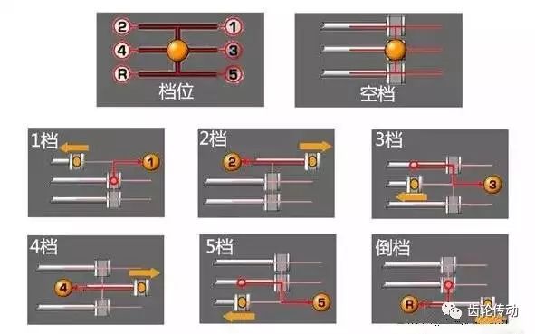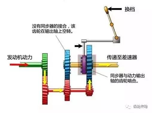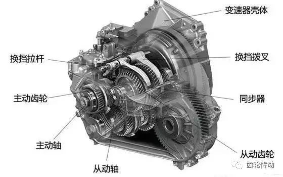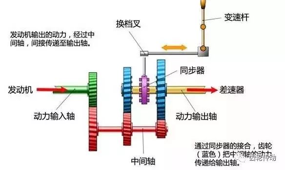 手動變速器的工作原理:通過撥動變速桿,切換中間軸上的主動齒輪,通過大小不同的齒輪組合與動力輸出軸結合,從而改變驅動輪的轉矩和轉速。
