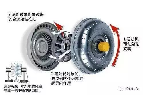 液力變矩器的作用是將發(fā)動機的動力輸出傳遞到變速機構。它里面充滿了傳動油,當與動力輸入軸相連接的泵輪轉動時,它會通過傳動油帶動與輸出軸相連的渦輪一起轉動,從而將發(fā)動機動力傳遞出去。其原理就像一把插電的風扇能夠帶動一把不插電的風扇的葉片轉動一樣。