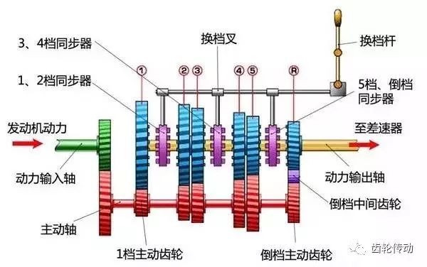 一般的手動變速器都有好幾個檔位(如上圖的5檔手動變速器),可以理解為在原來的基礎上添加了幾組齒輪,其實原理都是一樣的。如當掛上1擋時,實際上是將(1、2擋同步器)向左移動使同步器與1擋從動齒輪(圖中①)接合,將動力傳遞到輸出軸。細心的朋友會發(fā)現(xiàn),R檔(倒車檔)的主動齒輪和從動齒輪中夾了一個中間齒輪,就是通過這個齒輪實現(xiàn)汽車的倒退行駛。