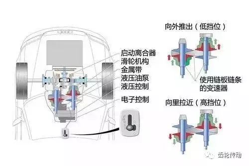 CVT無級變速箱的主要部件是兩個滑輪和一條金屬帶,金屬帶套在兩個滑輪上?;営蓛蓧K輪盤組成,這兩片輪盤中間的凹槽形成一個V形,其中一邊的輪盤由液壓控制機構控制,可以視不同的發(fā)動機轉速,進行分開與拉近的動作,V形凹槽也隨之變寬或變窄,將金屬帶升高或降低,從而改變金屬帶與滑輪接觸的直徑,相當于齒輪變速中切換不同直徑的齒輪。兩個滑輪呈反向調節(jié),即其中一個帶輪凹槽逐漸變寬時,另一個帶輪凹槽就會逐漸變窄,從而迅速加大傳動比的變化。