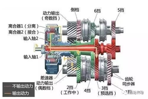 下圖是一個大眾6速DSG雙離合變速箱的工作原理圖。兩個離合器與變速箱裝配在同一機構內,其中一個離合器(1)負責掛1、3、5和倒擋;另一個離合器(2)負責掛2、4、6擋。當駕駛員掛上1擋起步時,換擋撥叉同時掛上1擋和2擋,但離合器1結合,離合器2分離,動力通過1擋的齒輪輸出動力,2擋齒輪空轉。當駕駛員換到2擋時,換擋撥叉同時掛上2擋和3擋,離合器1分離的同時離合器2結合,動力通過2擋齒輪輸出,3擋齒輪空轉。其余各檔位的切換方式均與此類似。