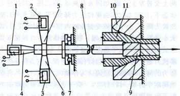 1、2、3-換能器;4、5、6-聚能器;7-壓力軸承8-拉桿;9-芯棒;10-外模;11-管料