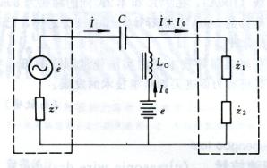 換能器部件之一的振子是采用鎳片疊合而成的。利用磁性材料在外磁場(chǎng)作用下產(chǎn)生微小宏觀變形在單方向伸長(zhǎng)和縮短,也可能產(chǎn)生體積收縮或膨脹(磁致伸縮效應(yīng)),將高頻電諧振變?yōu)闄C(jī)械振動(dòng)。處于工作狀態(tài)的磁致伸縮換能器的等效電路如圖4。圖中左側(cè)虛線框內(nèi)是超聲波發(fā)生器的輸出等效電路,由高頻正弦激勵(lì)電源e’和內(nèi)阻抗乏z’組成;右側(cè)虛線框內(nèi)是換能器的等效電路,z1’、z2’分別為鉗定阻抗和動(dòng)態(tài)阻抗。