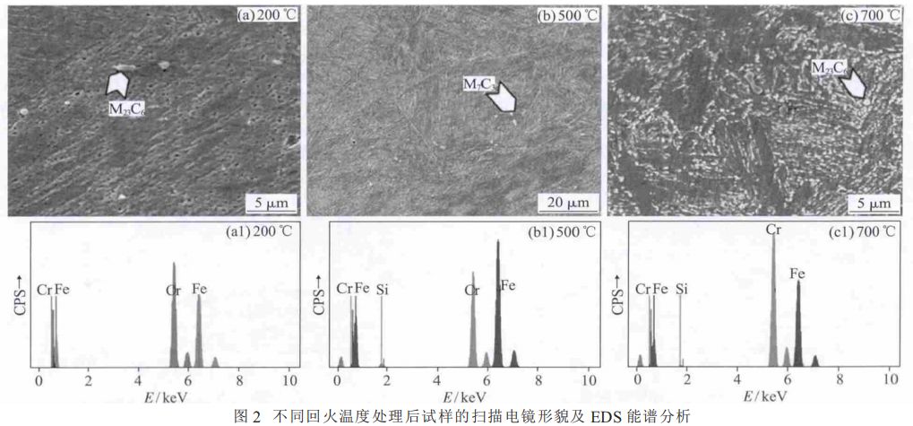 圖2(a)~(c)為不同回火溫度處理后試樣的掃描電鏡組織。圖2(a1)~(c1)為其對應的EDS能譜分析結果。試樣的回火溫度分別為 200、500 和700℃,回火時間均為60min,各試樣的奧氏體化工藝一致,均為 1050℃-60min。從圖 2 中可看出,200 、500和 700 ℃回火后試樣組織中的碳化物組成分別為M23C6、M7C3 和 M23C6,而且隨著回火溫度的升高,材料組織中的析出相數量明顯增多。